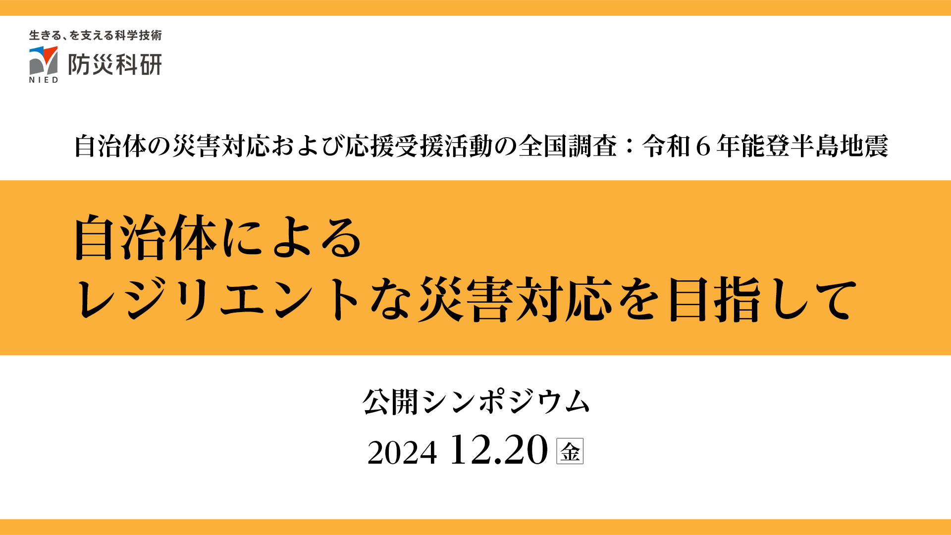 2024年12月20日に開催された「自治体によるレジリエントな災害対応を目指して」。 近い将来に発生が懸念されている首都直下地震や南海トラフ地震のような国難災害において、わが国は適切な対応が可能なのでしょうか。 防災科研は、令和6年1月に発生した能登半島地震において、災害対応や応援活動に取り組んだ自治体や自治体職員を対象として、自治体の災害対応・応援受援活動の全国調査を実施しました。調査の進捗状況と、暫定的な成果の一部をご報告します。