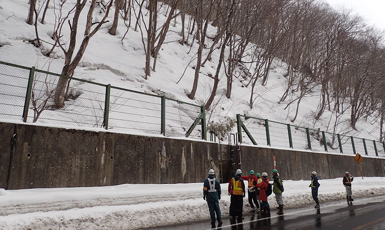 図2 斜面の積雪状況と防雪対策施設の点検作業