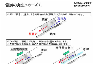 雪崩には2つの種類があり、雪が地表面で滑ると全層雪崩、雪の内部で滑ると表層雪崩が発生します。全層雪崩は、表面に亀裂が入る前兆現象が現れることがありますが、表層雪崩の場合そのような前兆現象があらわれません。雪の吹きだまりや雪が張り出したような状態の場所などは特に注意しましょう。