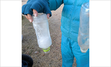 冬ならではの実験に挑戦したリポート。バケツに⽔を⼊れたら明⽇の朝凍るかな?氷の厚さは?薄い氷はどんな形?ペットボトルに⼊れた⽔を振ったら凍るかな?タオルブンブン回したら凍るかな?