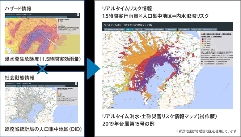 この取組を進めることで、防災科研内部のみならず、外部の社会動態データや他機関の研究者のデータとも連携しやすくなり、様々な情報を地図上に一元化して使うことができる、より価値ある情報プロダクツの創出が可能になります。