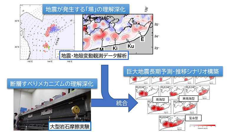 歴史史料や地質調査、地震・地殻変動観測から、大きな地震が発生しうる場所やその長期的な発生可能性をある程度まで評価できるようになってきました。しかし、それでも「いつ、どこで大きな地震が発生するか」を確実に知ることは出来ません。さらに、南海トラフ沿いの地震等、将来備えるべき大地震のイメージは漠然としたままです。この状況を打開し、地震による災害を軽減するためには、巨大地震が発生するメカニズムの理解を深めること、それに基づいた地震発生の予測手法を確立すること、それらの結果を用いて将来発生しうる巨大地震像をより具体的に示すことが必要です。本研究プロジェクトでは、地震が起きている場所の様々な特徴の把握や理解を進めるとともに、これらの成果を統合した巨大地震発生・推移シナリオ作成に向けた研究を行います。