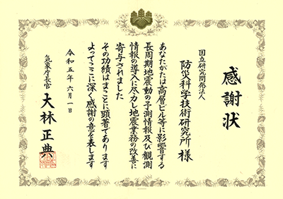 2023年2月から緊急地震速報に追加された長周期地震動の予測情報及び観測情報の導入などに防災科研の研究成果が活用された功績で、防災科研に対して気象庁長官より感謝状をいただきました。6月1日に開催された気象記念日式典において表彰され、地震津波火山ネットワークセンターの青井真センター長が代表して感謝状を受け取りました。