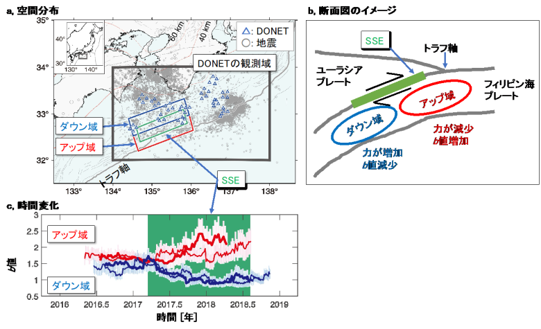 図1: (a) DONETが観測した地震活動。西日本があるユーラシアプレートの下にフィリピン海プレートが沈み込んでいます。プレート境界でゆっくりと滑るSSEが2016年から2017年にかけて紀伊水道沖で発生しました(緑の四角)。(b) SSEにより力が増加する地域(ダウン域)と力が減少する地域(アップ域)ができます。(c) SSE が滑りはじめると、ダウン域とアップ域の地震活動に基づくb値はそれぞれ減少、増加する傾向を示しました。ここで、緑で示す期間はSSEの起きた期間を示します。太線と細線は、開発した技術のパラメータを若干変えても結果の傾向は変わらないことを示しており、安定して技術を運用できることを示しています。