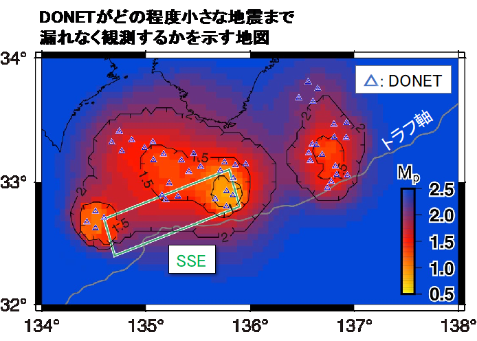 図2:DONETがどの程度小さい地震まで漏れなく観測するかを示す地図。例えば、”2”で示される曲線の内側ではマグニチュード2以上の地震であれば漏れなく観測できることを示します。同様に”1”で示される曲線の内側ではマグニチュード1以上の地震であれば漏れなく観測できることを示します。SSEの起きた地域周辺ではマグニチュード2程度であればほぼ漏れなく観測されることを示しているで、そのようなデータのみを用いてb値を算出する技術を開発しました。