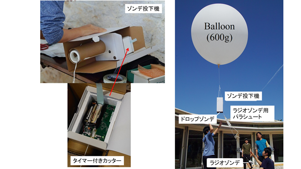 左下:本研究グループで開発・検証した投下型気象測器ドロップゾンデ。