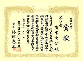 清水文健客員研究員(前総合防災研究部門総括主任研究員)が、「5万分の1地すべり地形図の作成」ほか一連の関連する諸論文により、平成23年度社団法人日本地すべり学会谷口賞を受賞しました。 本賞は、多年にわたり地すべり防止技術の発展に貢献したと認められた研究者・グループに与えられるものです。