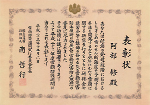 阿部修雪氷防災研究センター新庄支所長は、(社)日本雪氷学会の推薦を受け、雪崩防災週間実行委員会(会長:国土交通省砂防部長)より「平成23年度雪崩災害防止功労者表彰」を受賞しました。