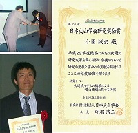 観測・予測研究領域 地震・火山防災研究ユニットの小園誠史研究員が日本火山学会研究奨励賞(第20号)を受賞し、日本地球惑星科学連合2013年大会中に表彰式が行われました。本賞は、火山学に関する優れた論文を発表し、将来、火山学の発展への貢献が期待される35才以下の火山学会会員に授与される賞です。