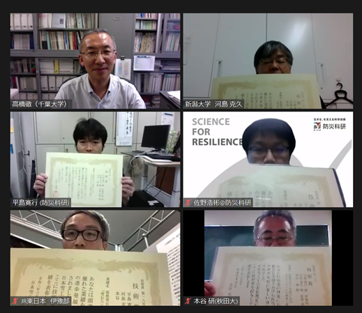 雪氷防災研究部門 平島寛行主任研究員、防災情報研究部門 佐野浩彬特別技術員が日本雪工学会技術賞を受賞しました。