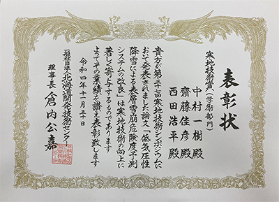 第37回寒地技術シンポジウムにおいて中村が発表した論文「低気圧性降雪による表層雪崩危険度予測システムの改良」が、寒地技術の向上に著しく寄与するものと判断されました。