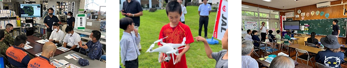 左:地域防災にドローン活用、右2枚:ドローン・ICTの活用を考える住民参加ワークショップ開催