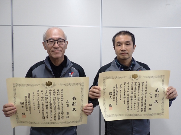 雪氷防災研究センターの上石勲特別研究員と山口悟上席研究員が、令和7年2月の大雪に際し、専門的な知見から自治体に対し雪崩の危険性の判断や応急対策等について技術的助言を行うなど雪崩災害防止に尽力されたとして、令和7年度雪崩災害防止功労者表彰を受けました。