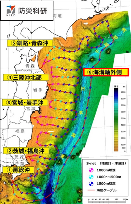 今般、S-netの観測点のうち、日本海溝より東側に設置された観測点(別紙参照)についても観測データを活用する準備が整ったことから、令和2年3月24日(火)12時より、これら観測点のデータを新たに緊急地震速報の発表に活用します。これにより、S-net全体の観測データを活用することとなります。