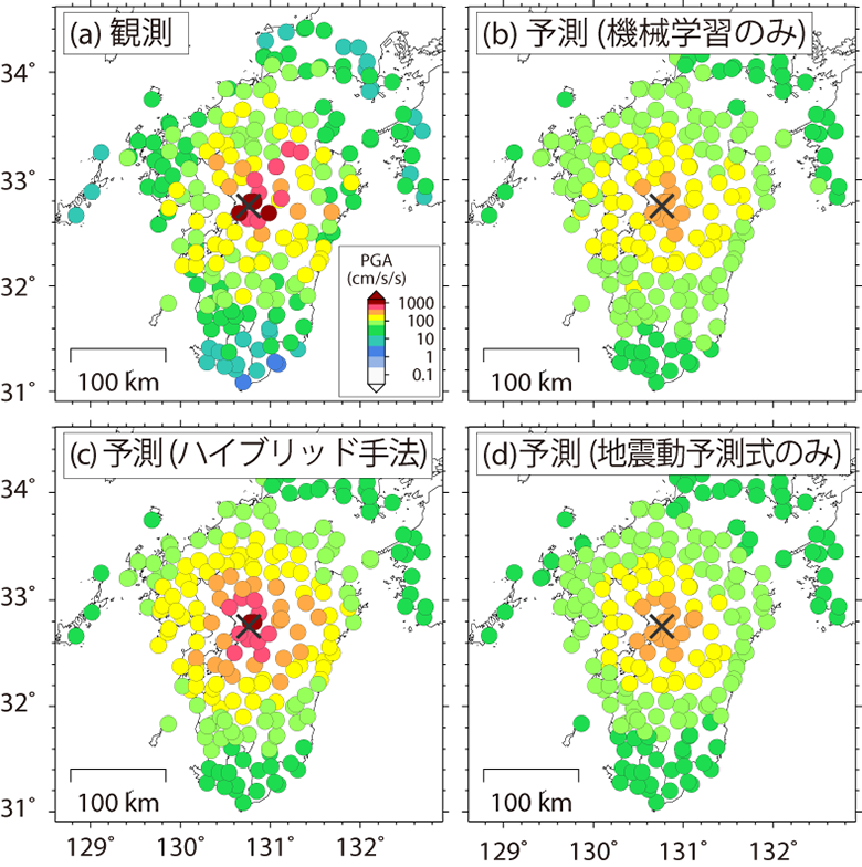 *Kubo et al. (2020, Scientific Reports)を改変図1:(a)平成28年熊本地震の本震において防災科研K-NET, KiK-netで観測された地表最大加速度(PGA)の分布。(b)機械学習のみによる予測。(c)機械学習と地震動予測式を組み合わせたハイブリッド手法による予測。(d)地震動予測式のみによる予測。
