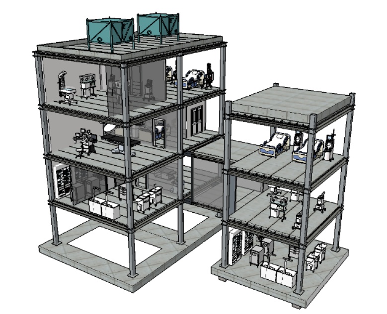 ②京都大学医学部附属病院の協力により再現した、各診療科の医療行為を支える高機能設備の地震時挙動の把握と機能損失度の定量的評価法の検証