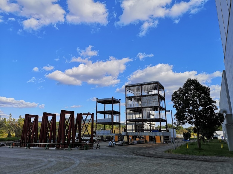 病院を想定した渡り廊下で繋がれた4階建て(耐震構造)と3階建て(免震構造)の鉄骨造建物を同時に揺らす当実験は世界初のものです。