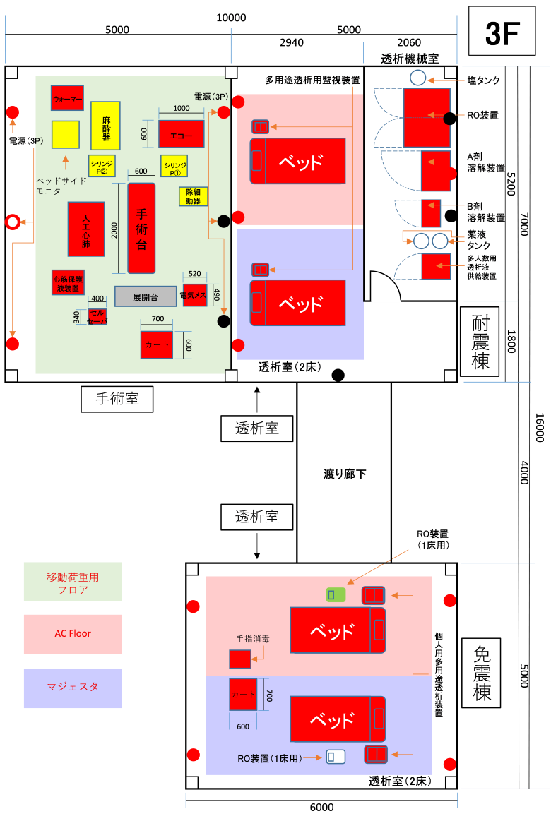 - 試験体内には診療科を模擬した室内を再現します。耐震建物の各居室は、2F(スタッフステーション、検査部、薬剤部、診察室、処置室)、3F(手術室、透析室)、4F(NICU、新型コロナウイルス感染症重症患者用病室)、免震建物の各居室は、1F(検査部、薬剤部)、2F(NICU)、3F(透析室)となっています。例として、図4に耐震建物と免震建物の3Fフロアのレイアウトを紹介します。京都大学医学部附属病院の協力により医療スタッフの指導を仰ぎながら、医療系学術・技術団体及び医療機器・設備メーカーの技術協力を得て、医療機器などの配置や使用状態をできるだけ実際の処置環境に近づけています。