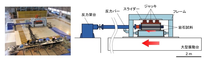 *Yamashita et al. (2021, Nature Communications)を改変図1 大型振動台を活用した岩石摩擦試験機の写真及び模式図。