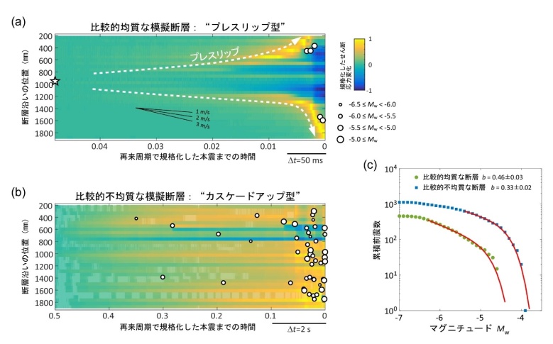 プレスリップが断層中央部から始まり加速度的に広がって本震に至っています。前震(○)はプレスリップ通過後に誘発されています。(b) 本震直前の比較的不均質な模擬断層面上のせん断応力と前震の時空間分布。前震が加速度的に発生し本震に至っています。(c) 二種類の断層で発生した前震の規模別頻度分布。傾きがb値を示しており、比較的不均質な断層の方が有意に小さいb値を示しています。 - (語句説明)