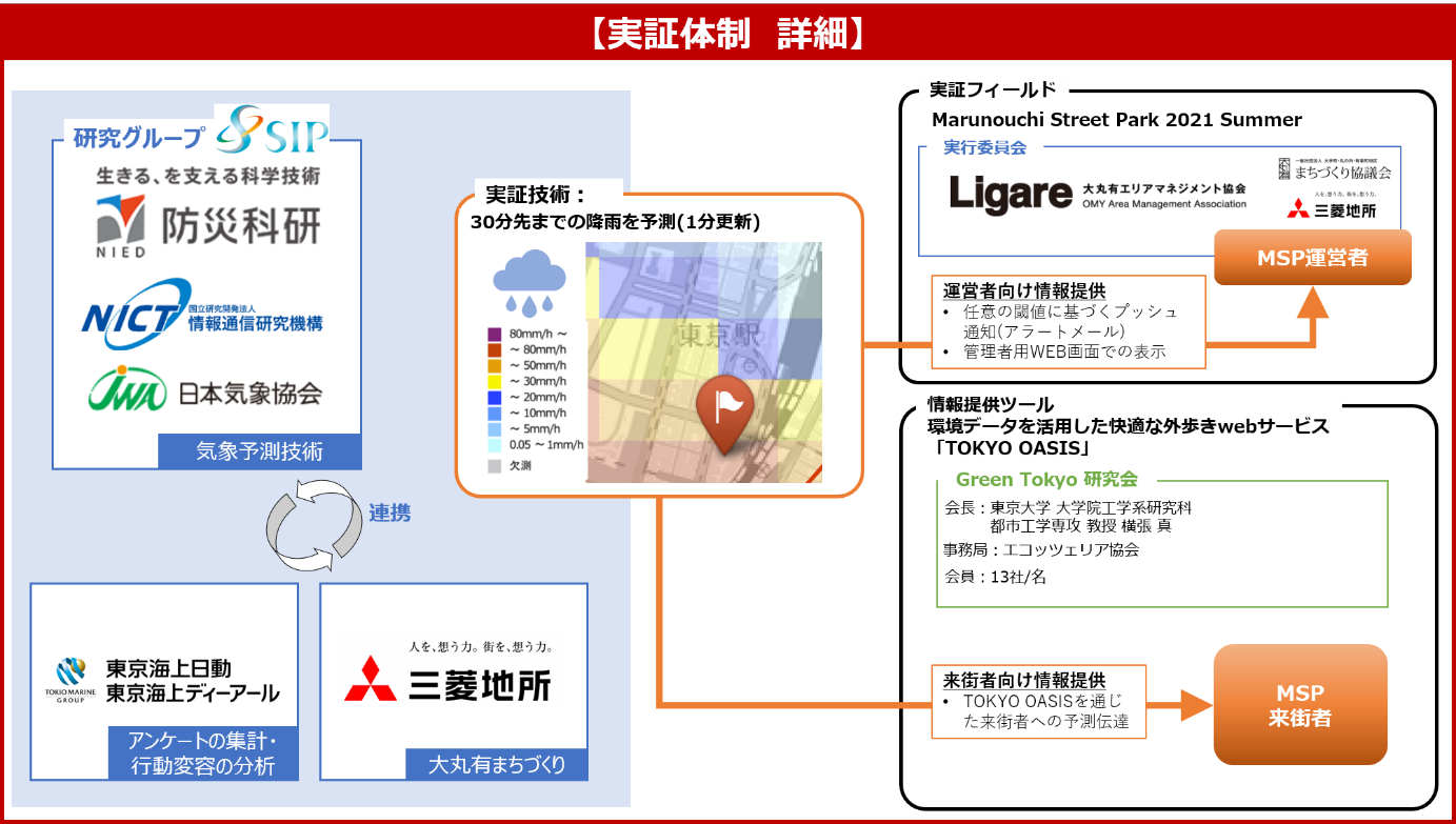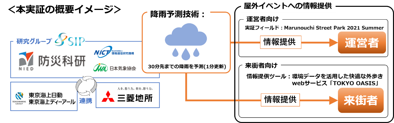 国立研究開発法人防災科学技術研究所(理事長:林 春男)、国立研究開発法人情報通信研究機構(理事長:徳田 英幸)、一般財団法人日本気象協会(会長:春田 謙)、東京海上日動火災保険株式会社(取締役社長:広瀬 伸一)、東京海上ディーアール株式会社(代表取締役社長:嶋倉 泰造)及び三菱地所株式会社(執行役社長:吉田 淳一)は、8月2日~9月12日に開催される「Marunouchi Street Park 2021 Summer」の期間中、運営者及び来街者に30分先までの直近の気象予測情報を提供する実証実験を行います。