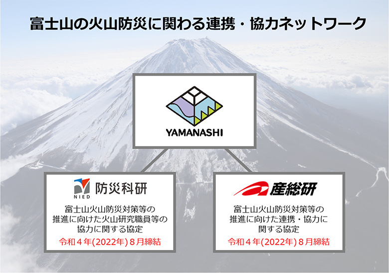 山梨県は国立研究開発法人産業技術総合研究所(以下、「産総研」という)とも同様の連携・協力協定を同日付で締結しました。また山梨県は富士山周辺自治体との間で、これまで同様の連携・協力を積極的に進めてきました。これにより、富士山を取り巻く、わが国で初めて火山防災対策に関する複数の地方自治体および研究機関からなる連携・協力ネットワークが構築されることになります。