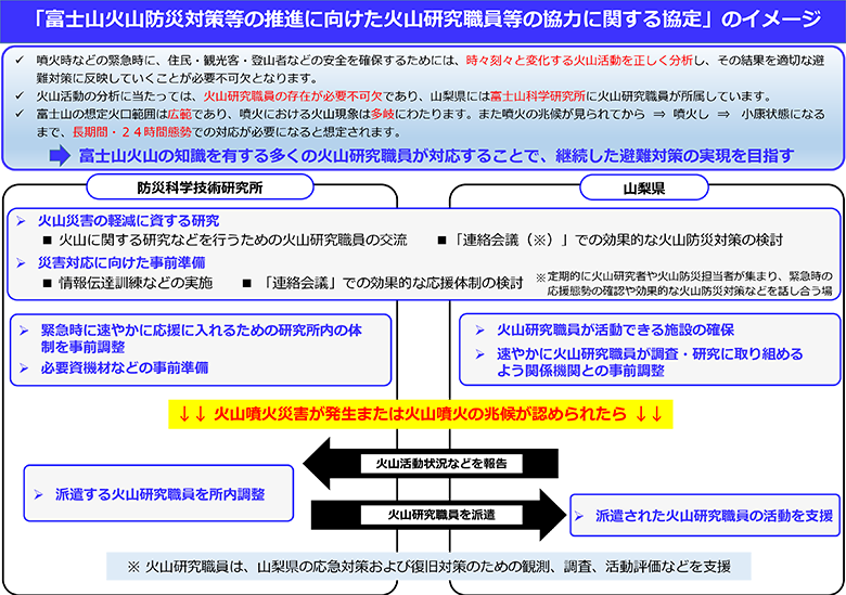一方、山梨県は富士山を擁する自治体の一つとして、住民、登山客、観光客を対象に「安全を確保するための富士山噴火総合対策」において「富士山の火山活動と防災対策に関する調査研究」や「国の火山研究機関とのネットワークの構築」を掲げ、関連自治体・公的研究機関との連携対応を積極的に進めており、2021年(令和3年)には神奈川県と「火山噴火時の相互応援及び火山研究職員等の交流に関する協定」を締結しました。 - 3.連携協定締結の内容
