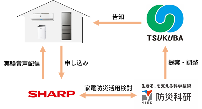 いつ発生するかわからない災害は、備えが後回しになりがちです。「もしも」のために備える従来型の防災だけではなく、日常生活の中で多くの方が使用する生活家電を活用することで、「誰も」が「いつでも」災害に備えることが可能と考えています。防災科研とシャープは、1年以上にわたり共同で気象警報や河川の氾濫、土砂災害などの防災情報の伝達媒体としてのIoT家電の活用、およびIoT家電から得られる情報を利用した公的機関の災害対応での活用について検討を重ね、このたび、防災情報の伝達媒体としての活用に関し、つくば市で実証実験の実施に至りました。