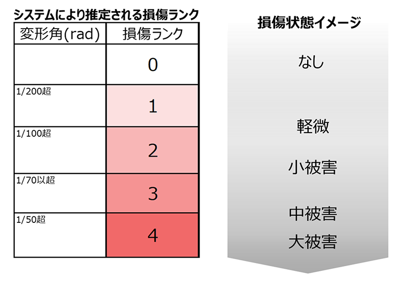 また、被害状況や建物損傷度を正確に把握するため、独自に5つの損傷ランクに分別しました。地震時の建物の瞬間的な最大の傾き(層間変形角)から被害状況を早急に把握し、精度を高め緻密にランク分けすることで、対応の優先順位付けが可能になります。構造体損傷、外壁のひび割れ、内装材(クロスなど)の損傷被害に対応する5つの損傷ランクをシステムによって推定します(図2)。これによって損傷ランクの大きい建物から対応することで、復旧工事の早期終結、受架電の本数削減※3など、災害対応の効率化、ひいては顧客への安心の提供を実現します。