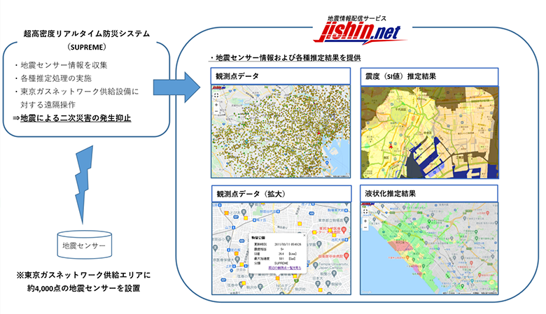東京ガスネットワークでは、地区ガバナといわれる地域毎に設けられた都市ガスの圧力調整器に、地震計(SIセンサー)を供給エリア内の約4,000カ所に設置しています。大規模地震発生時に二次災害を未然に防ぐことを目的に、その観測点のデータを収集・分析し、被害が大きいと推定された地域を素早く見つけ出し、ガスの供給を遠隔で停止できるような超高密度リアルタイム地震防災システム(SUPREME)を構築しています。SUPREMEにて収集した観測点データや各種推定結果を東京ガスiネット株式会社が保有するjishin.netによって、外部にサービス提供しています(図4)。