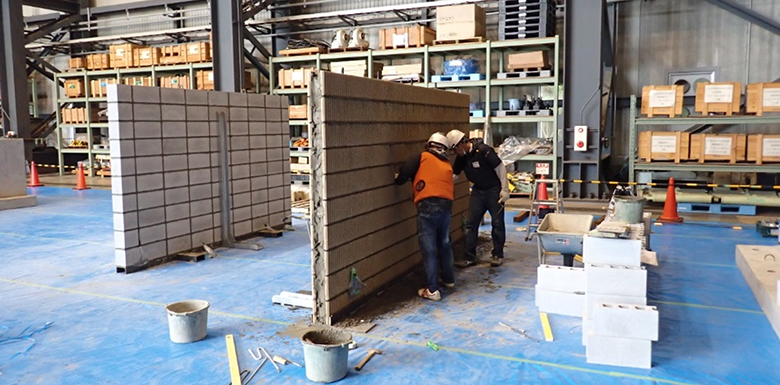 現在、ブロック塀の施工においては、建築基準法を基に行われていますが、古くからのブロック塀も存在しており、それらの安全性、限界性能の評価および様々な知見は国民の関心事項となっています。そこで、本実験では、建築基準法適合、建築基準法不適合、建築基準法不適合に耐震補強を施したもの、新たな構造を採用したものなど全8種類のブロック塀を試験体として製作し、実際の地震動をベースとした加振実験で検証します。 - 2.実験概要