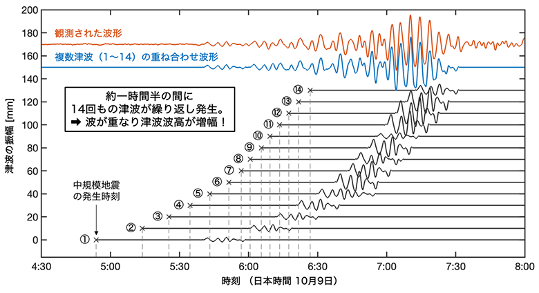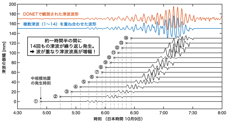 中規模地震が発生した時刻(x印つき灰色破線)に発生した14の津波波形(黒線1〜14)の重ね合わせによって得られた津波波形(青線)が、実際に観測された波形(赤線)を高精度に再現している。特に、後半の津波(黒線9〜14)は各津波波形の山と谷のタイミングがそれぞれほぼ一致したため、重ね合わさった津波の波高は、個々の波高の二倍程度に増幅した。なお、横軸はDONETにおける津波の観測時刻、縦軸は津波の振幅(各波形のゼロをずらして表示)を示している。