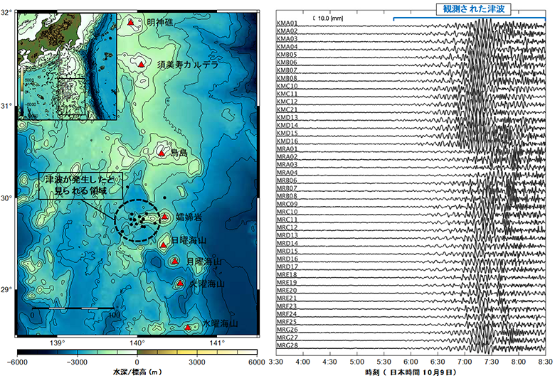 (左図)伊豆諸島・鳥島近海の海底地形。多くの活火山である火山島・海底火山(赤色三角形)が連なっている。2023年10月9日の津波発生領域は、孀婦(そうふ)岩から30—40km南西の海域で発生したと見られ、この領域では同日午前4時頃から複数のマグニチュード4〜5の中規模地震が観測されていた(黒丸)。(右図)海底地震・津波観測網DONETの42観測点で記録された津波波形。津波は早いところで午前5時40分頃から観測され始め、それから1時間20分ほど遅れて午前7時頃から最大の津波波高を記録した。
