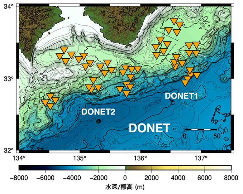 南海トラフでの地震や津波の観測を目的とした観測網で、国立研究開発法人 海洋研究開発機構によって開発されました。2016年4月に国立研究開発法人 防災科学技術研究所に移管されたこのシステムは、南海トラフ海域の四国と紀伊水道沖に51ヶ所の観測点を有し、様々なセンサー(強震計、広帯域地震計、水圧計、ハイドロフォン、微差圧計、温度計)を使用し、地殻変動から地震動や津波まで、様々な信号を捉えることが可能です。