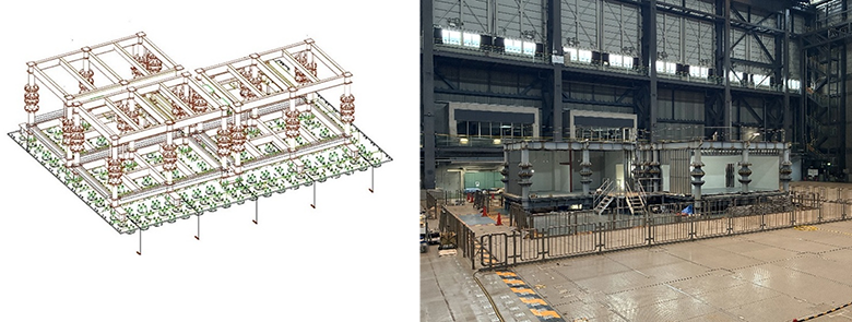 - 今回の実験に用いる検証用実験ユニットは、柱スパンで8×5m、基準高さは3.85m、質量は1体あたり約57ton(床スラブを含む)となっており、繰り返しの使用を可能とするため、主要構造部材を無損傷に留める強固な設計で製作されています。内部は検証目的に応じて、設置する非構造部材、屋内設備、家具、什器等を組み替え、室内環境を変化させることができ、これにより効率的に室内空間に同一条件での振動台実験が可能となります。また、検証用実験ユニットは、それぞれに結合可能で、より広い室内空間を再現させることができます。本実験では検証用実験ユニットを平面方向に3体設置し加振実験を行う予定です(図2、3)。