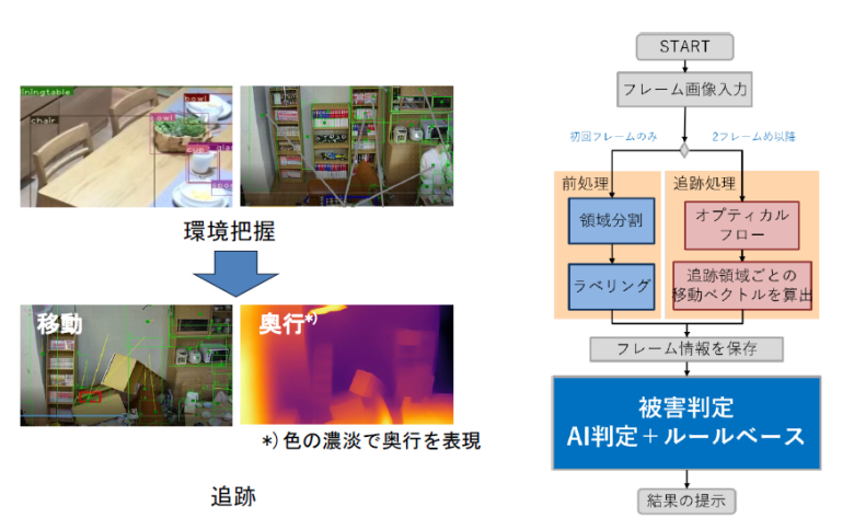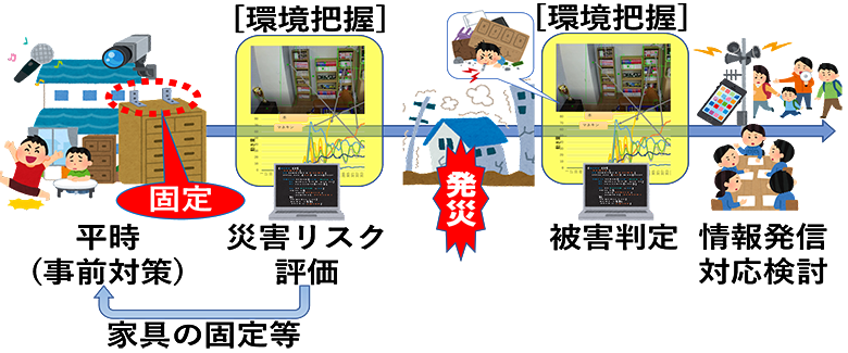 図6 本研究がめざす災害前後の取り組みこのうち、画像・音響データ等を用いた環境把握、被害判定法の検討、被害度の指標の検討においては、人が被害状況を判断するのと同様に、画像データよりAI技術などを活用し、瞬時に被害度を判定し、その後の活動に役立てることを目指しています。