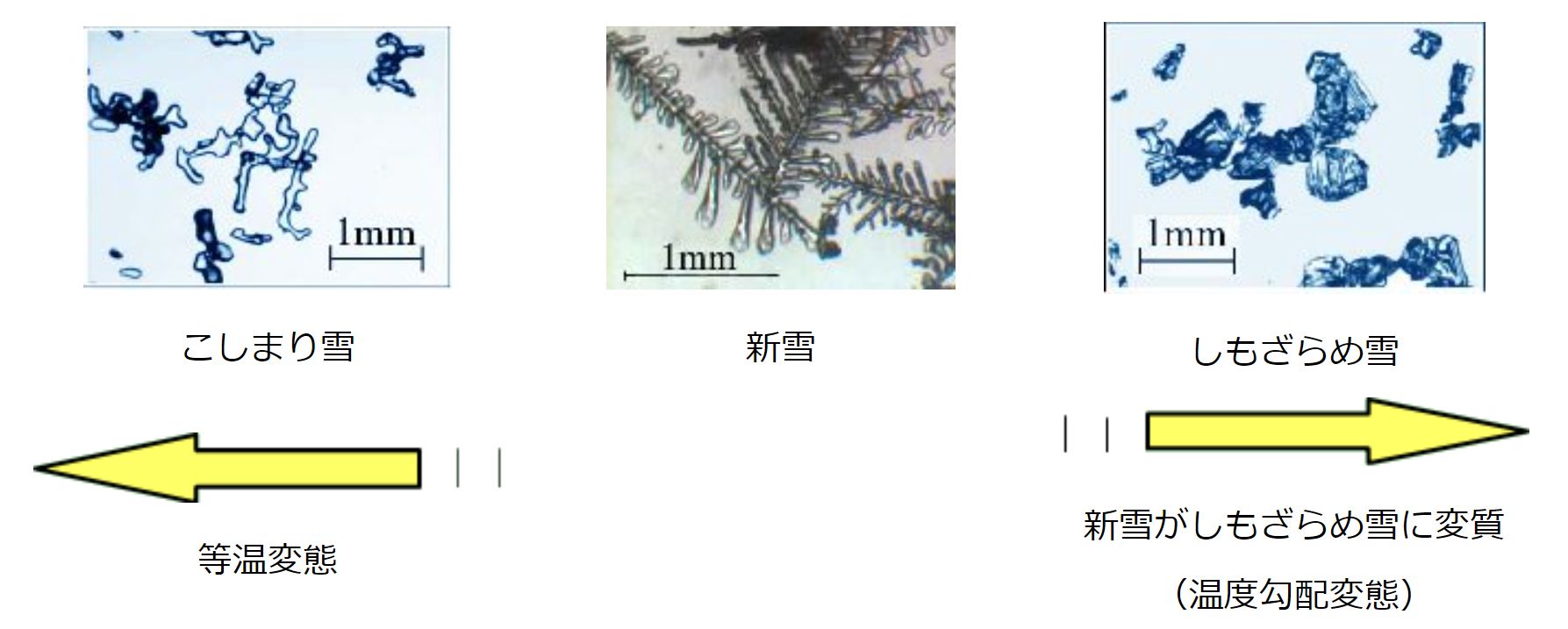 雪の形や性質は、降り積もった後、気温や日射などの気象条件や雪自身の重量により時間とともに変化していきます。雪の性質は、雪の深さと同様に、雪氷災害の発生に深く関わっています。