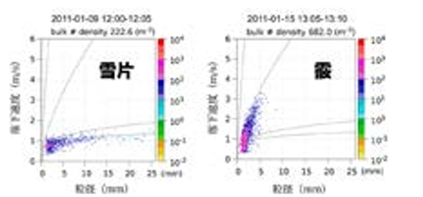 雪氷災害の危険度を面的に把握するためには、どこにどれだけの雪が降るかという降雪量分布とともに、どのような雪が降るかという降雪特性の分布を知る必要があります。そのための方法として、観測には気象レーダー、予測には気象予測モデルが用いられています。このような、気象レーダーや気象予測モデルの精度を高めていくためには、多様性に富んだ降雪粒子の諸特性(形状、密度、構成結晶、含水状態など)について、地上での検証観測を行うとともに、これらを定量的に扱うための研究を進めています。