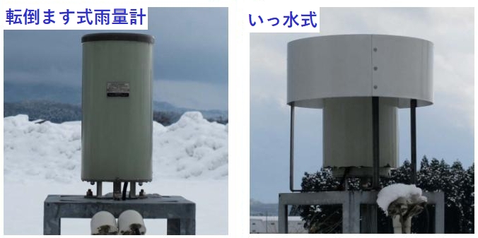 いっ水式雨量計(右)受雪部の水槽中に表面を油膜で覆った温水が入っており、降雪粒子を捉え易くし、かつ蒸発を防ぐ構造になっています。