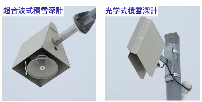 超音波式積雪深計(左):雪面に超音波を真下に発射して、反射波が届くまでの時間から積雪深を計測します。 光学式積雪深計(右):雪面にレーザー光を斜めに投射し、反射して戻ってくる光波と基準光波の位相差(時間差)から積雪深を計測します。
