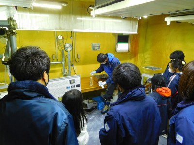 低温室はマイナス5℃。0℃以下なのに、凍らない水について説明をしています。